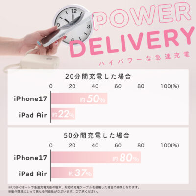 iPhone 17だと30分で約50%充電できます。