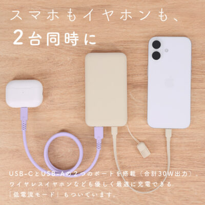 USB-Cでスマートフォンを充電しながら、USB-Aでワイヤレスイヤホンを充電する。