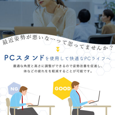 例えば、ノートパソコンスタンドを使用すると、適切な高さや角度にパソコンを調整できます。姿勢が改善され、身体の疲れが軽減することで、快適なデスクワークに繋がるでしょう。