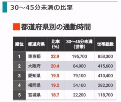 2025年9月に発表された「令和5年住宅・土地統計調査 住宅及び世帯に関する基本集計」では、各世帯の中で家計を主に支える者が通勤する時間を都道府県別に調査しています。