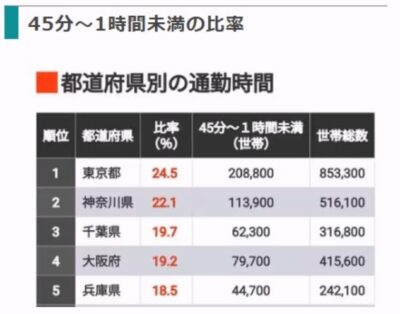 通勤時間が「15~30分未満」と回答した人の中では香川県(42.5%)が最も多く、「30~45分未満」は東京都(22.9%)、「45分~1時間未満」も東京都(24.5%)、「1時間~1時間30分未満」は埼玉県(23.9%)が最も多いという結果でした。つまり、1時間~1時間30分ほど通勤時間を要している人が一番多いのは埼玉県であることがわかります。