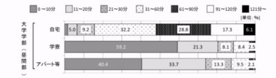 2024年3月に日本学生支援機構が発表した「令和4年度 学生生活調査結果」によると、大学生の片道の通学時間は、自宅からの通学者は「31~60分」が最も多く、学寮やアパート等からの通学者は「0~10分」が最も多い結果でした。