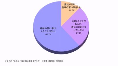 2022年にマイボイスコム株式会社が実施したインターネット調査では、直近一年間に趣味の習い事をした人が11.7%、つまり約8.5人に一人が趣味の習い事に挑戦していることが分かりました。また、直近一年間にはしていないものの、以前習い事をしたことがある人は27.1%で、合わせて4割弱の人が習い事の経験があることが分かりました。