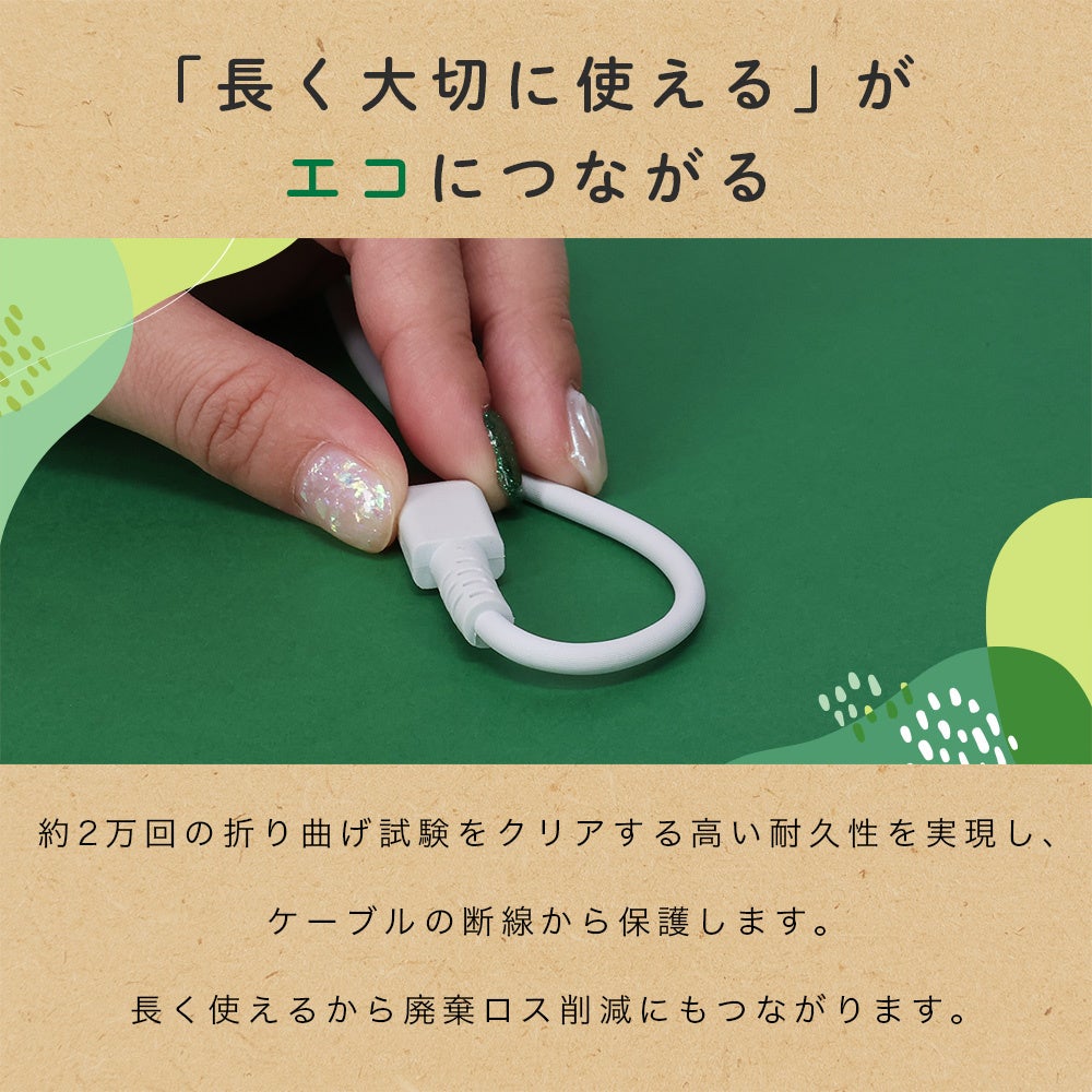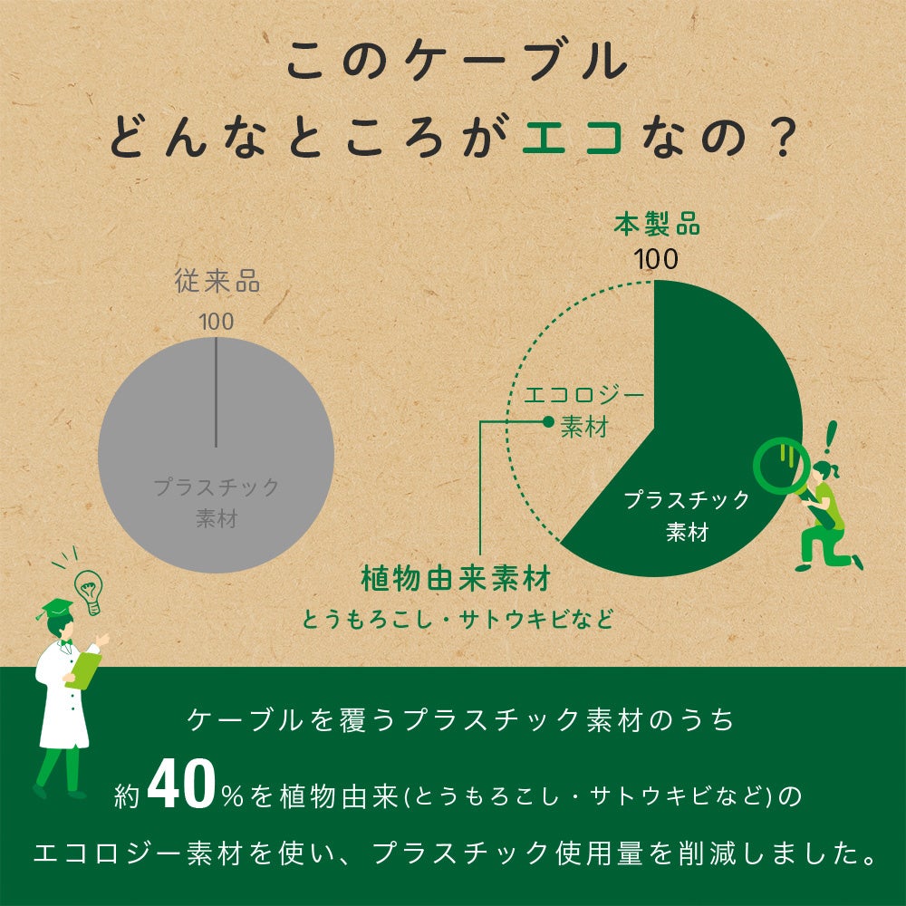 MOTTERUのケーブルの特徴でもある断線と折り曲げに強い耐久性はそのままに、ケーブルを覆うプラスチック素材のうち、約40%を植物由来素材(トウモロコシ・サトウキビなど)のエコロジー素材を使用しプラスチック使用量を削減した「地球の未来を考えた」エコロジーケーブルです。
