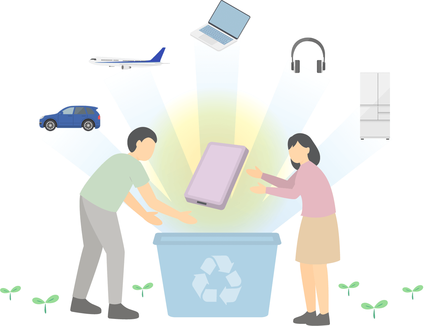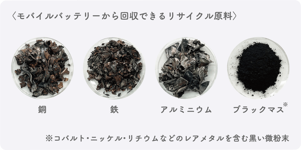 モバイルバッテリーには、コバルト、ニッケル、リチウムといった希少な金属資源(レアメタル)が使用されており、限られた資源の有効活用が必要不可欠で、そのリサイクルには高度な技術が必要です。