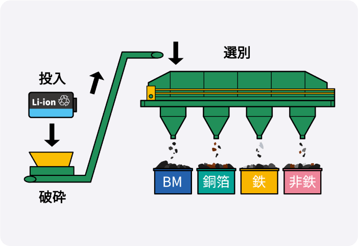 焼成し、無害化されたバッテリーを粉砕し、モバイルバッテリーに含まれる素材ごとに細かく選別します。