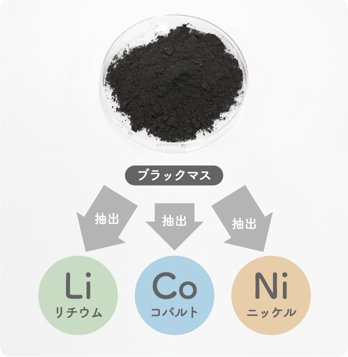 分別したブラックマスを、さらに精製して、リチウム・コバルト・ニッケルなど個別に分離、回収します。